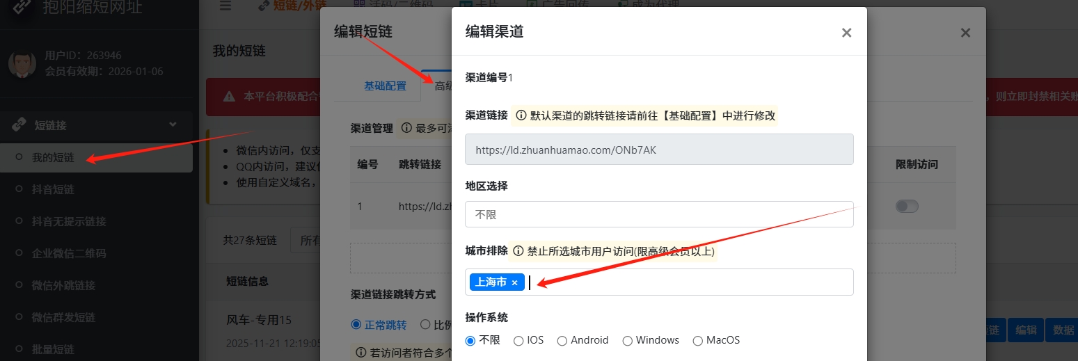 - 如果需要屏蔽具体某些城市,可以使用我的短链功能设置屏蔽的城市.详细操作步骤