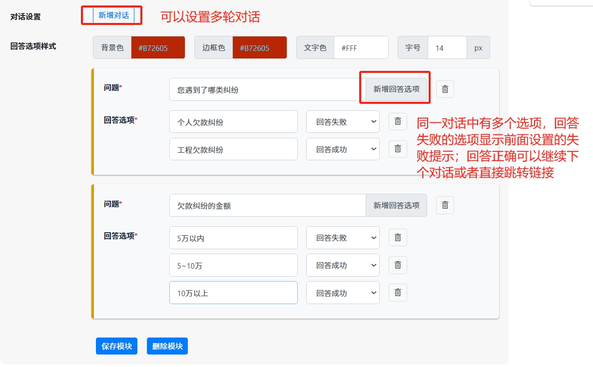 点击【新增对话模块】,用户跳转前先让用户回答线索相关的问题,过滤无效的线索,提升广告质量