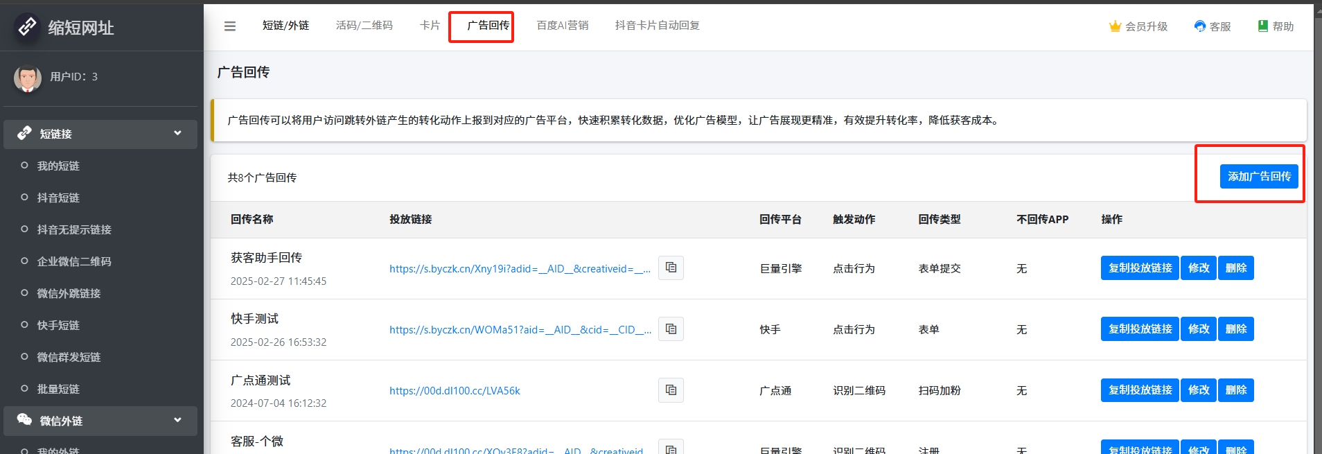 1.到管理后台,在【广告回传】中新建广告回传