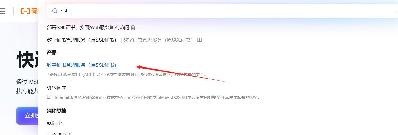 - 到阿里云官网首页,输入SSL,选择【数字证书管理】,然后登录控制台