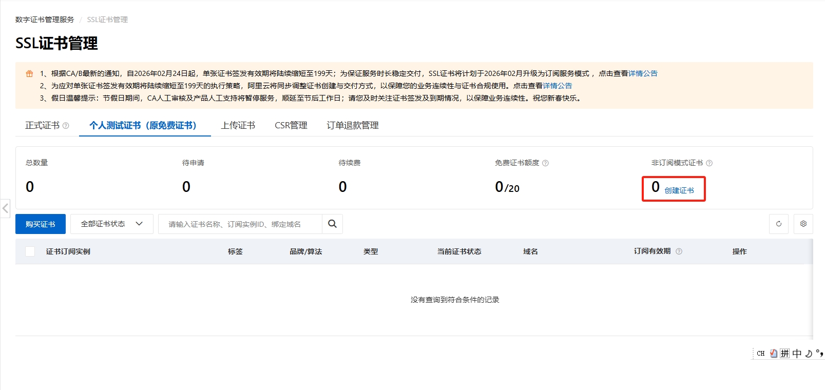 - 购买后,点击【创建证书】,输入你的域名和信息
