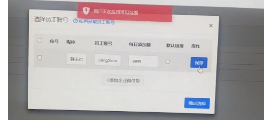 - 产生原因:在做企微授权时,没有把该员工选择到应用可见范围内,导致应用没有权限贴加该员工。